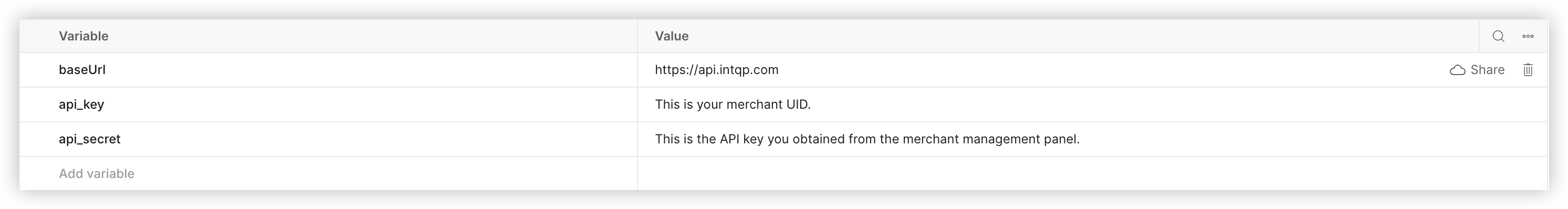 api_key: This is your merchant ID.api_secret: This is the API key you obtained from the merchant management panel.base_url: This should be set to your API base URL- Production: